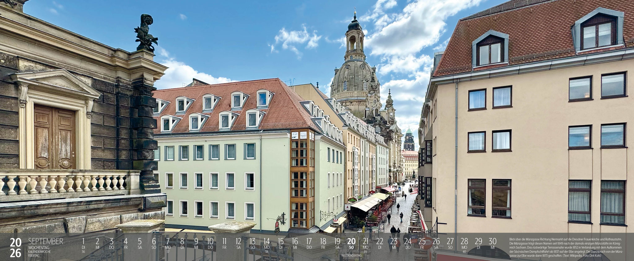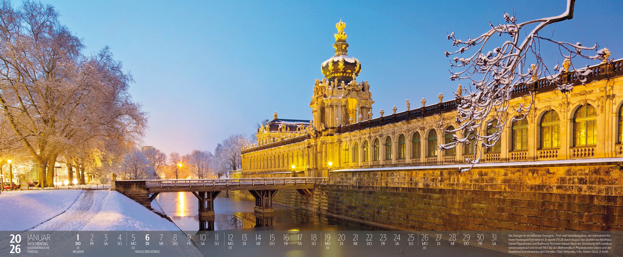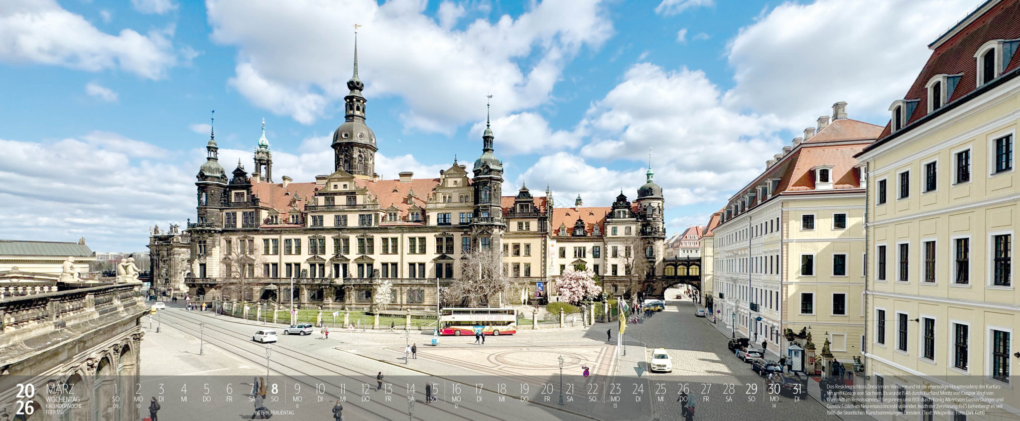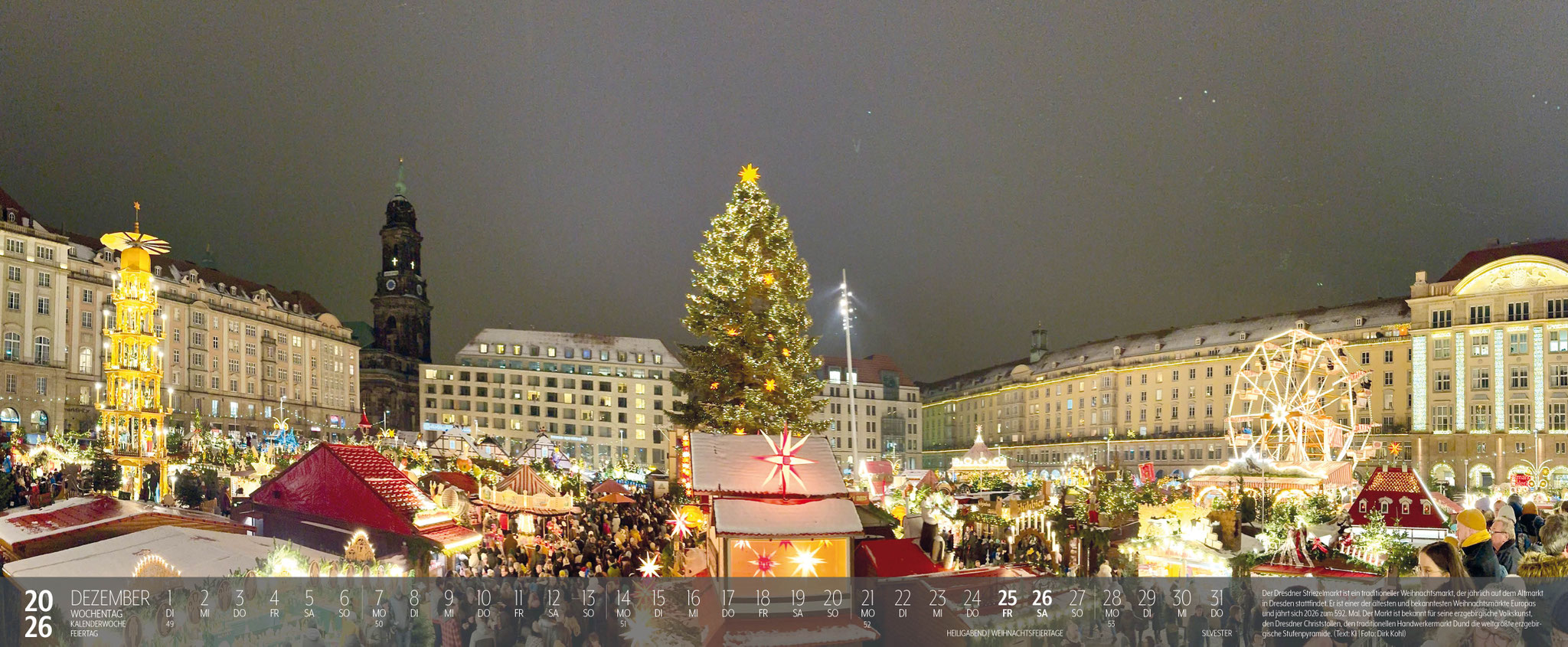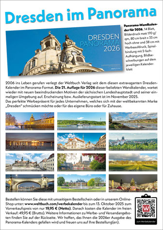 Seit 2006 verlegen wir diese extravaganten Dresden-Kalender im Panorama-Format. Die 21. Auflage für 2026 dieser beliebten Wandkalender wartet wieder mit neuen beeindruckenden Motiven der sächsischen Landeshauptstadt Dresden und seiner faszinierenden Region auf. Das perfekte Werbepräsent für jedes Unternehmen, welches sich mit der weltbekannten Marke „Dresden“ schmücken möchte oder für das eigene Büro oder für Zuhause. Erscheinung bzw. Auslieferungsstart ist für Anfang/Mitte November 2025 geplant.