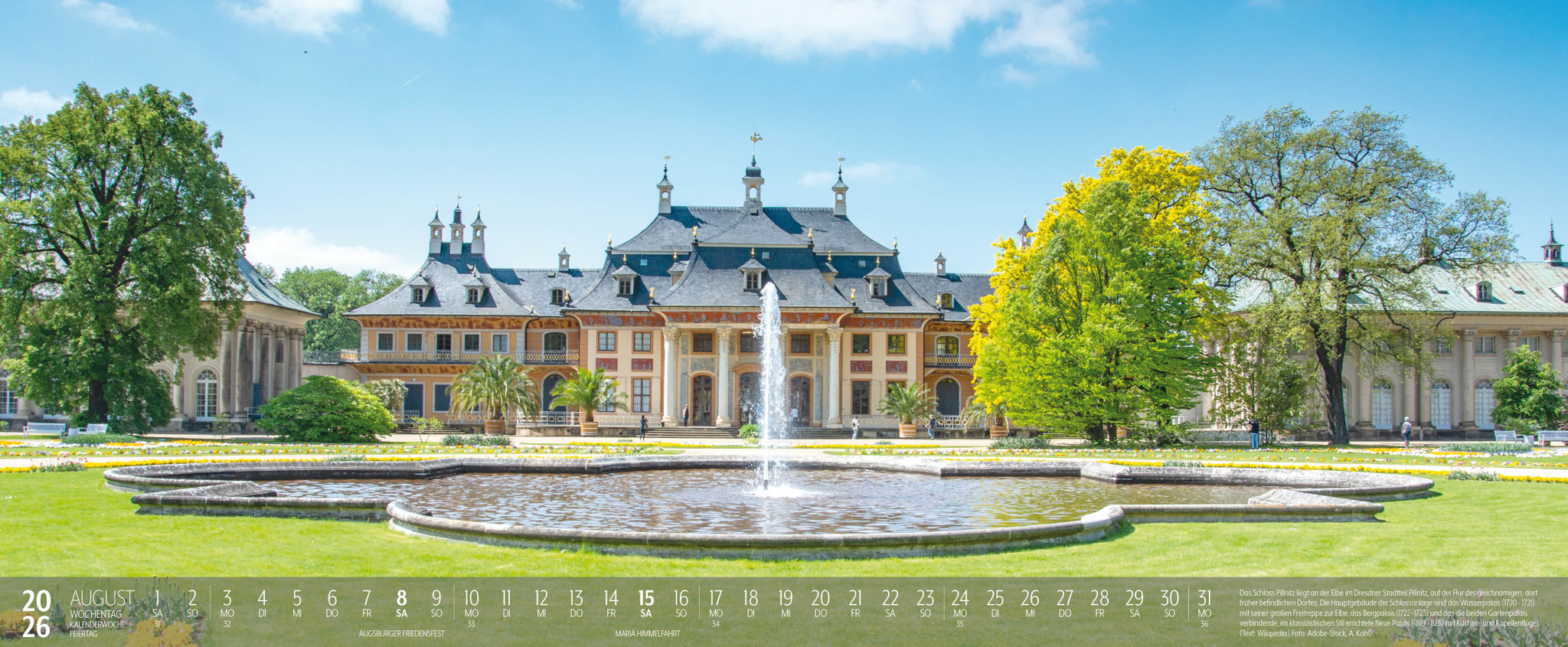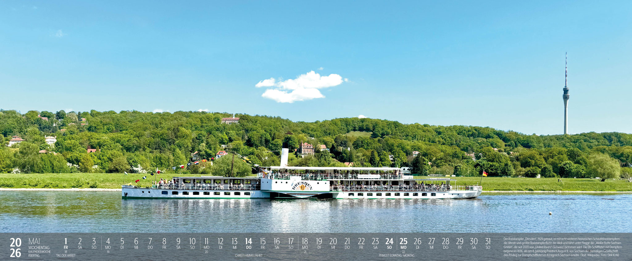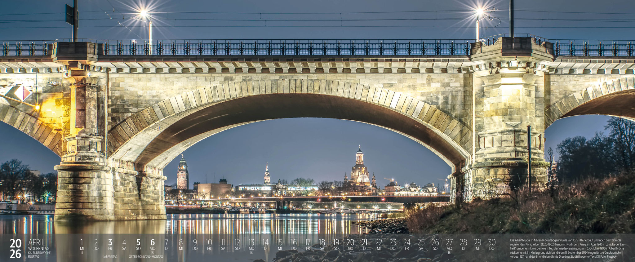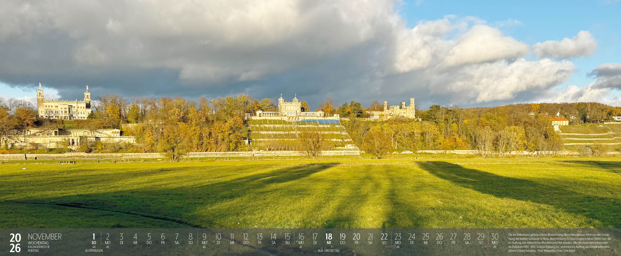 Seit 2006 verlegen wir diese extravaganten Dresden-Kalender im Panorama-Format. Die 21. Auflage für 2026 dieser beliebten Wandkalender wartet wieder mit neuen beeindruckenden Motiven der sächsischen Landeshauptstadt Dresden und seiner faszinierenden Region auf. Das perfekte Werbepräsent für jedes Unternehmen, welches sich mit der weltbekannten Marke „Dresden“ schmücken möchte oder für das eigene Büro oder für Zuhause. Erscheinung bzw. Auslieferungsstart ist für Anfang/Mitte November 2025 geplant.
