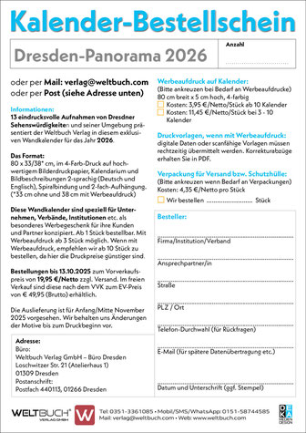Diese Wandkalender sind speziell für Unternehmen, Verbände, Institutionen, Vereinen etc. als besonderes Werbegeschenk für ihre Kunden und Partner konzipiert und ab 1 Stück (mit Werbeaufdruck ab 3 Stück) zum Vorverkaufspreis bestellbar. Bestellungen nimmt ausschließlich der Weltbuch Verlag bis 13. Oktober 2025 zum Vorverkaufspreis von 19,95 €/Netto pro Stück entgegen. Danach sind diese zum empfohlenen Endverbraucherpreis von 49,95 €/Brutto ohne Werbeaufdruck im freien Verkauf erhältlich.